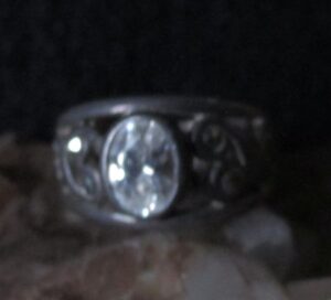 This powerful deity is attached to an offering: Sterling silver size 5 U.S (Europe 9.32) carved with oval zircon stone and 8 round small stones.