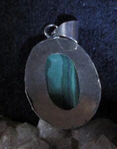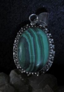 This powerful deity is attached to an offering: Silver plated malachite stone pendant measuring about 1 3/4 inches.